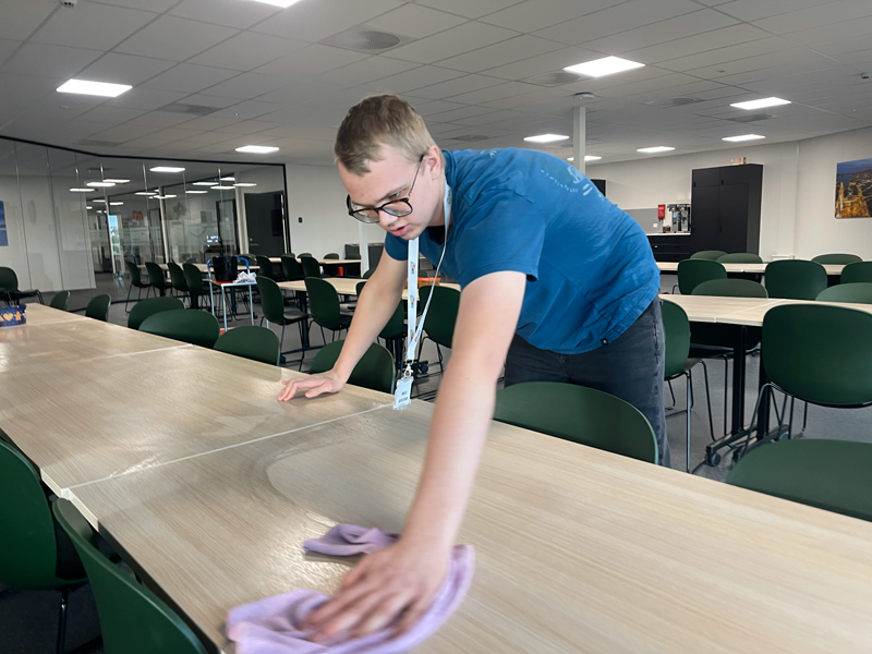 - Jeg liker meg veldig godt her, alle hilser og snakker med meg, og jeg får jobbe i fred, sier han. Og forteller om oppgavene sine som er mange, i tillegg til å rydde og vaske alle bordene i kantina skal kaffemaskinene som står rundt om vaskes, renses og etterfylles. Møterom skal holde i orden, tøy skal sorteres og legges i system.